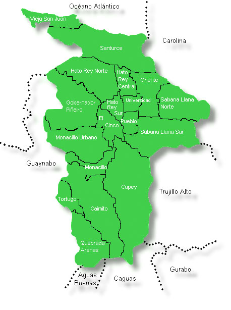 Caimito, Cupey, Monacillos, Pueblo, Quebrada Arenas, Sabana Llana y Tortugo.
